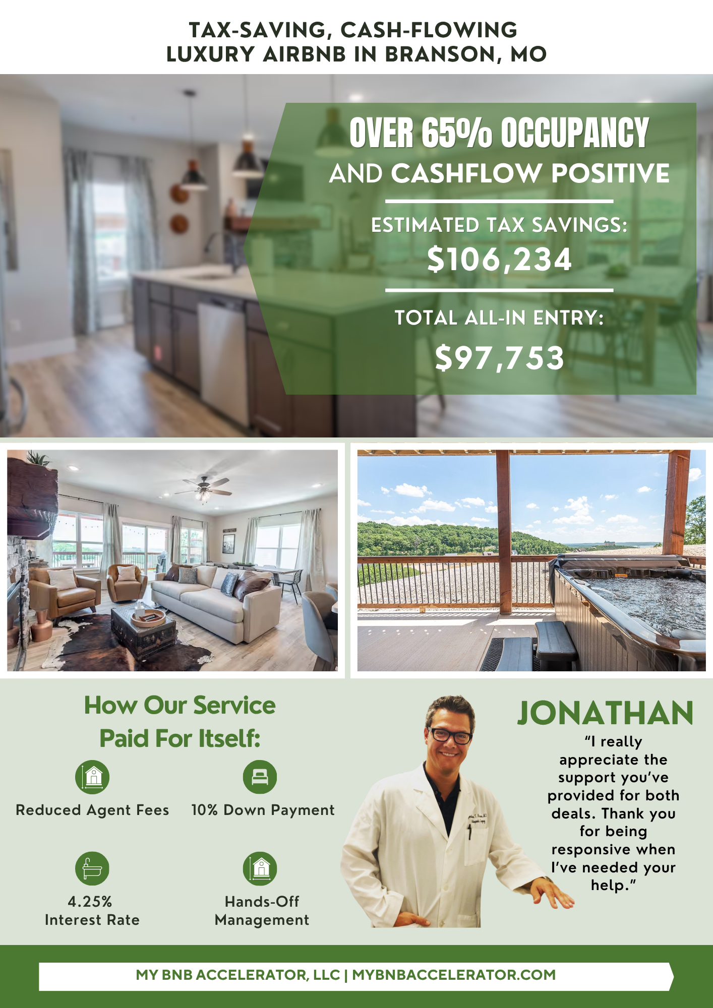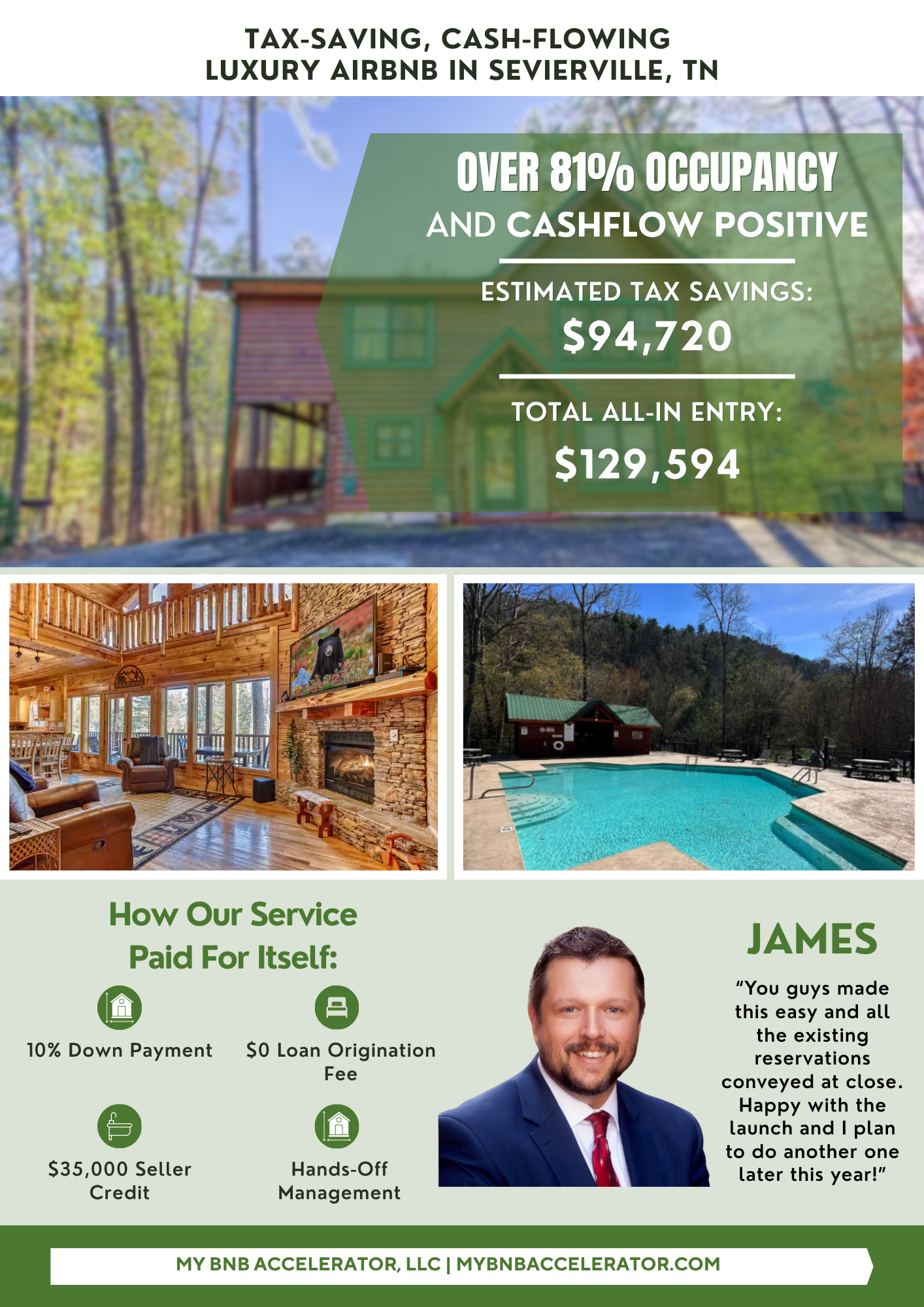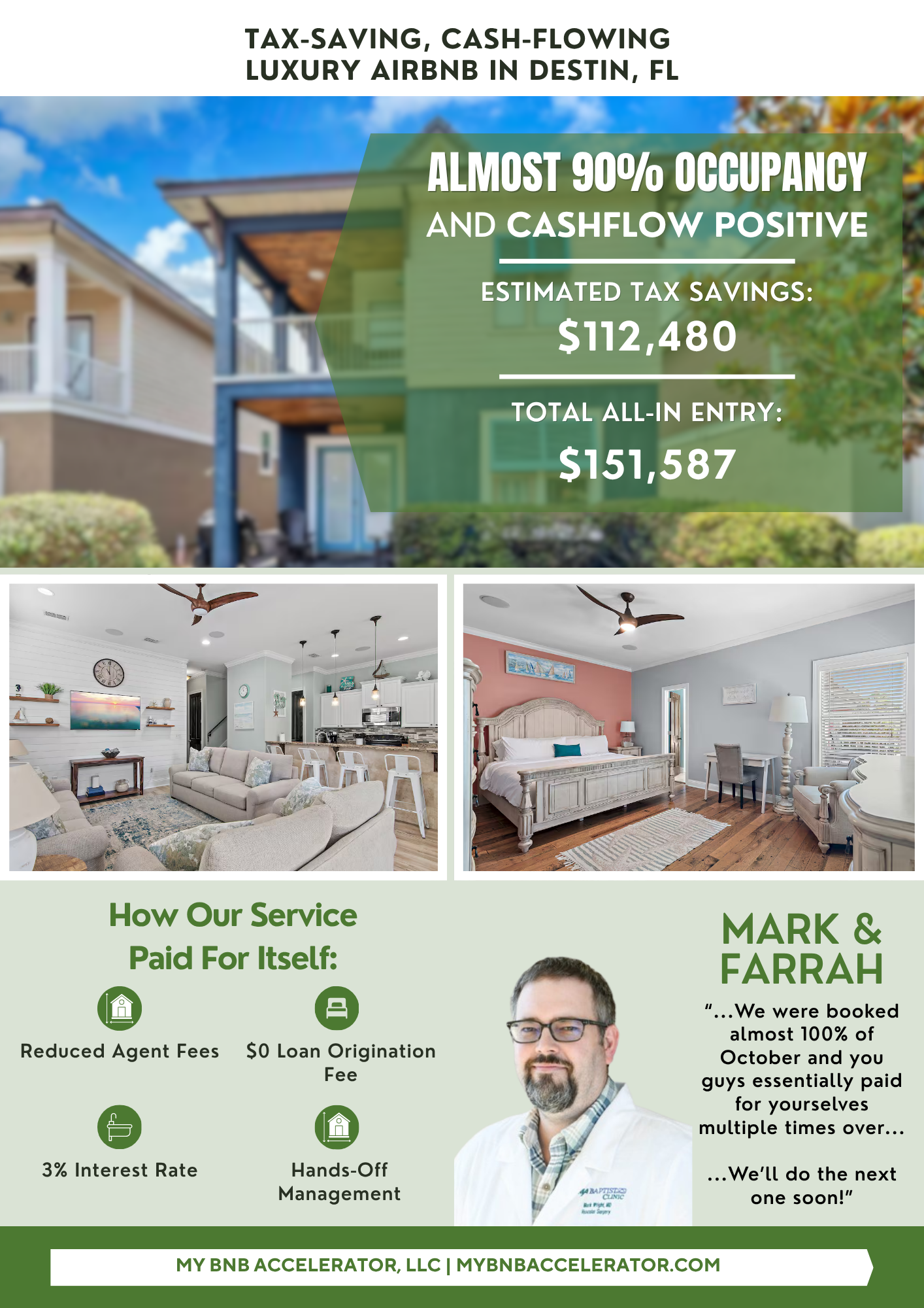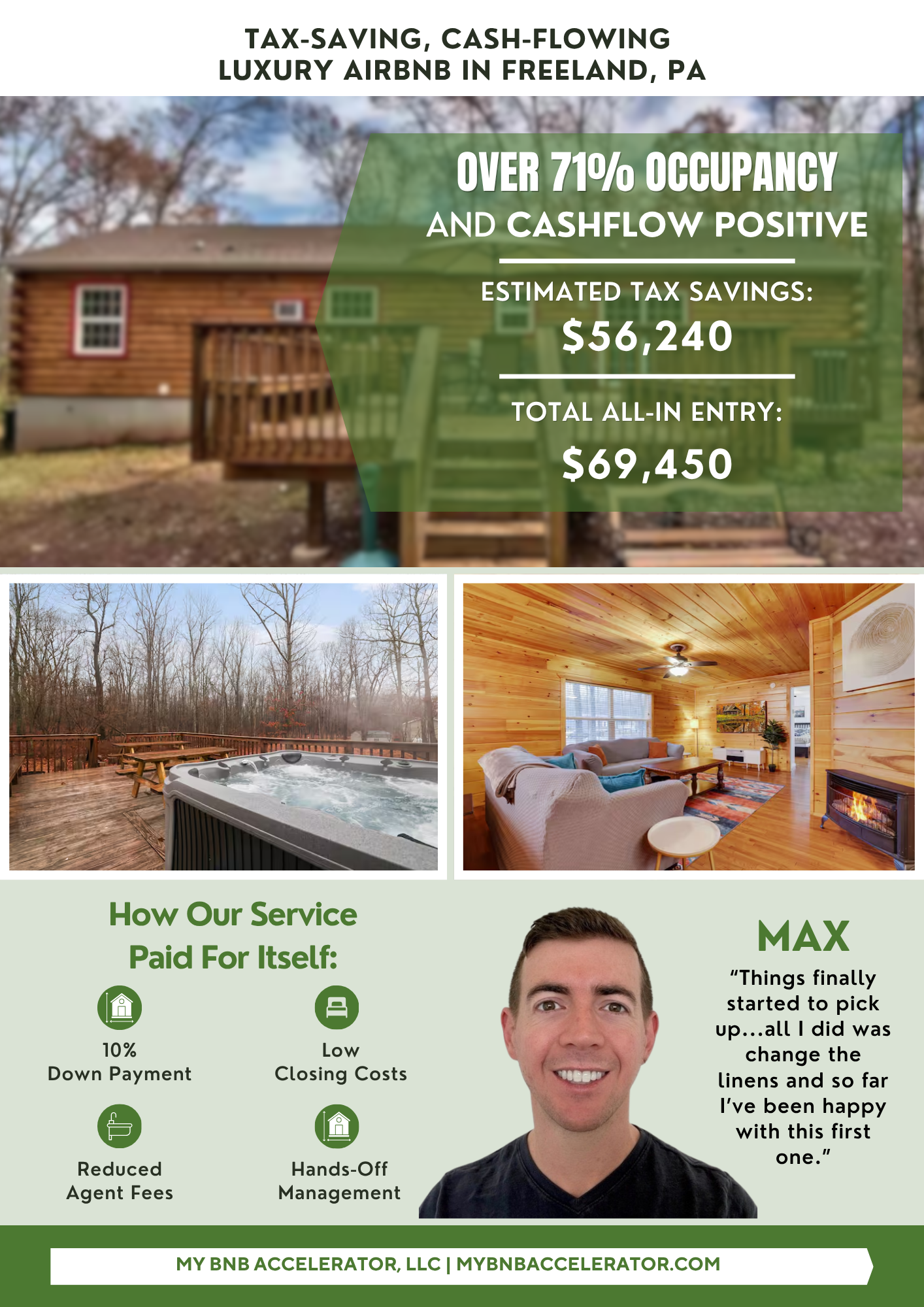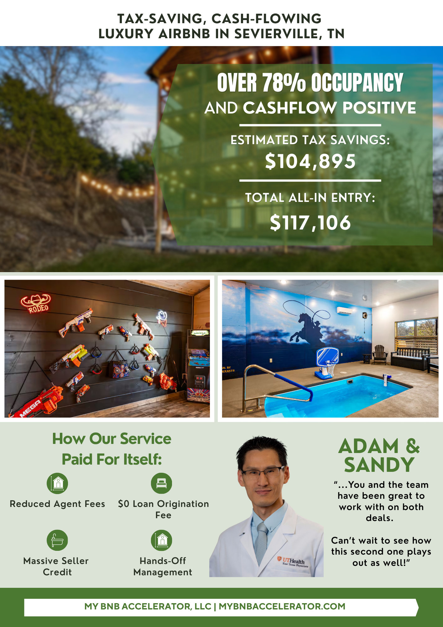 We (My BnB Accelerator, LLC) are not an attorney or legal counsel, nor does Company represent itself as such. Company does not provide any legal advice - Client must engage with proper Legal counsel with an outside third party for all matters related to legal counsel or legal advice. Company My BnB Accelerator, LLC is not a Certified Professional Accountant (CPA) or Tax Advisor, nor does Company represent itself as such. Company does not provide any Tax advising. Client must engage with proper Tax advising and Tax Strategy counsel with an outside third party for all matters related to Tax strategy, tax preparation, and bonus depreciation items. Company My BnB Accelerator, LLC works with their own third party tax advisors, Certified Professional Accountants, attorneys, lenders, and other specialty advisors that are all third party services. Client is ultimately responsible for verifying their work with any and all third party vendors not associated with the immediate My BnB Accelerator, LLC team. Please note that we may be affiliates of the vendors we recommend. You are absolutely under no obligation to use their products or services but if you do choose to use them, we may earn a small commission at no extra cost to you. The content in these videos and written content across these pages shall not be construed as tax, legal, insurance, construction, engineering, health & safety, electrical, or financial advice; it is your responsibility to verify all information yourself. It is highly recommended that you speak with a tax professional or tax attorney before performing any of the strategies mentioned in this video.