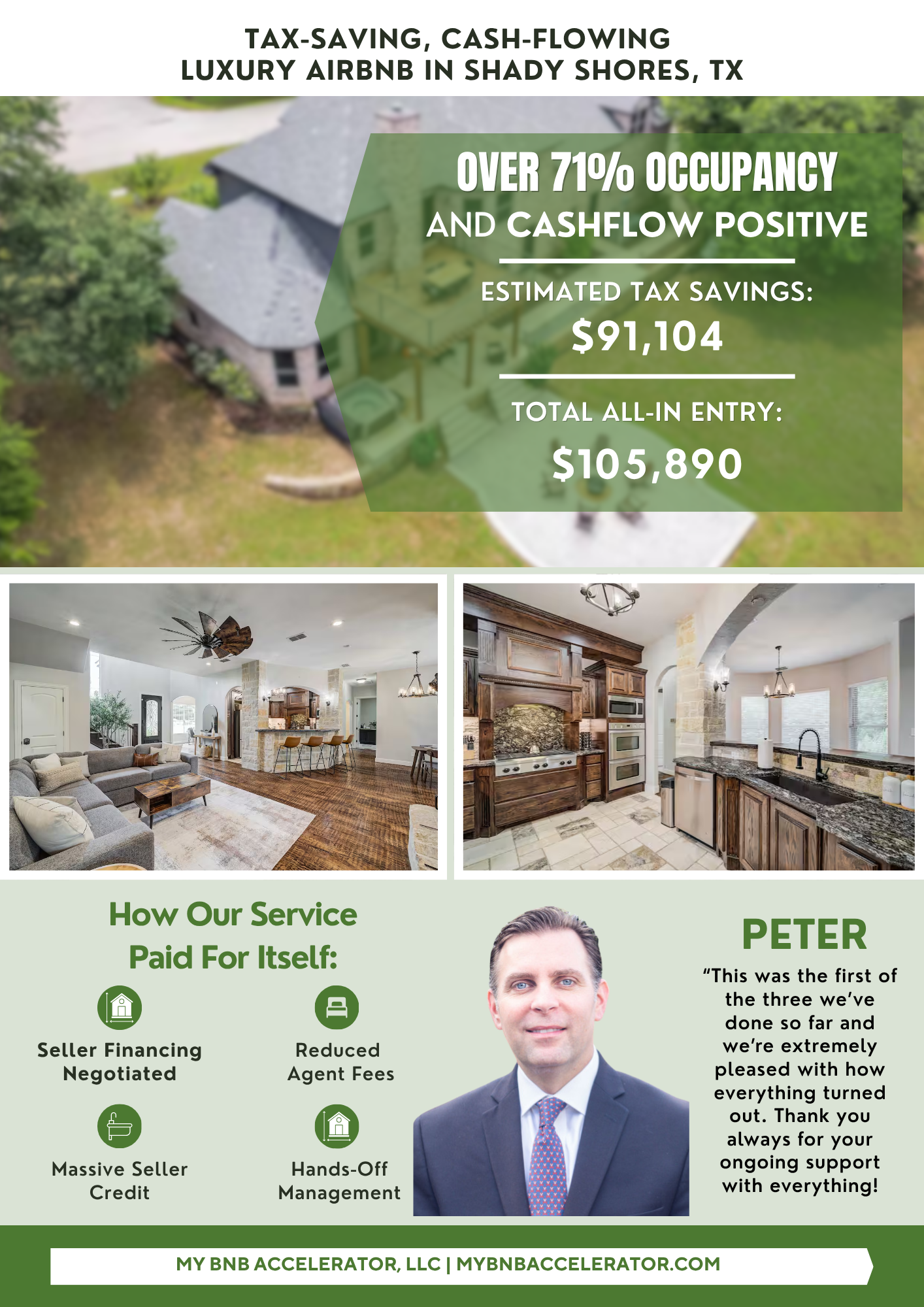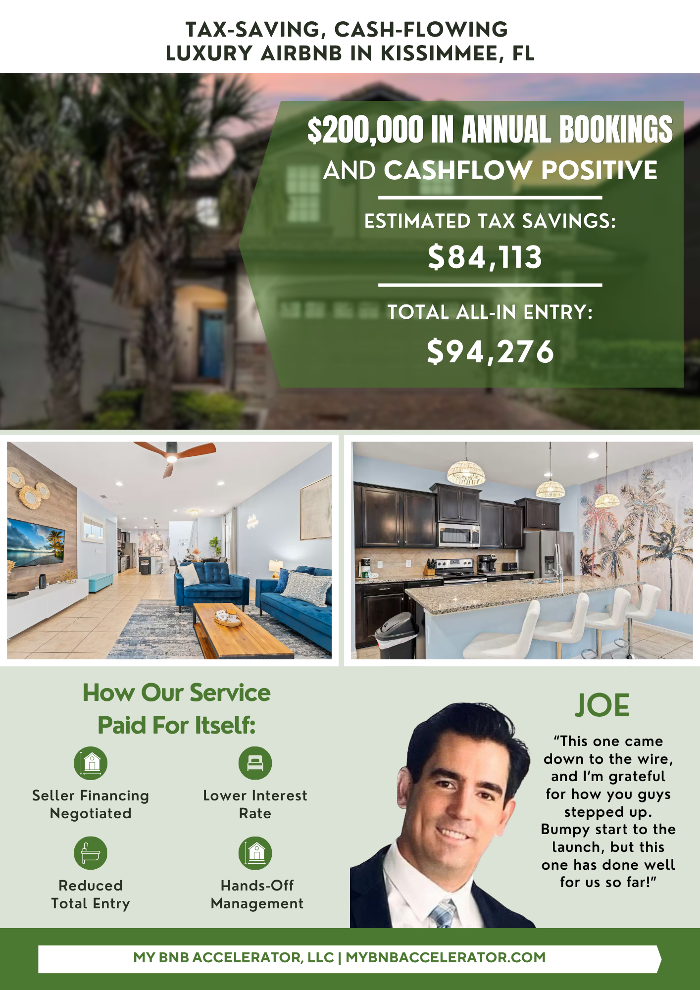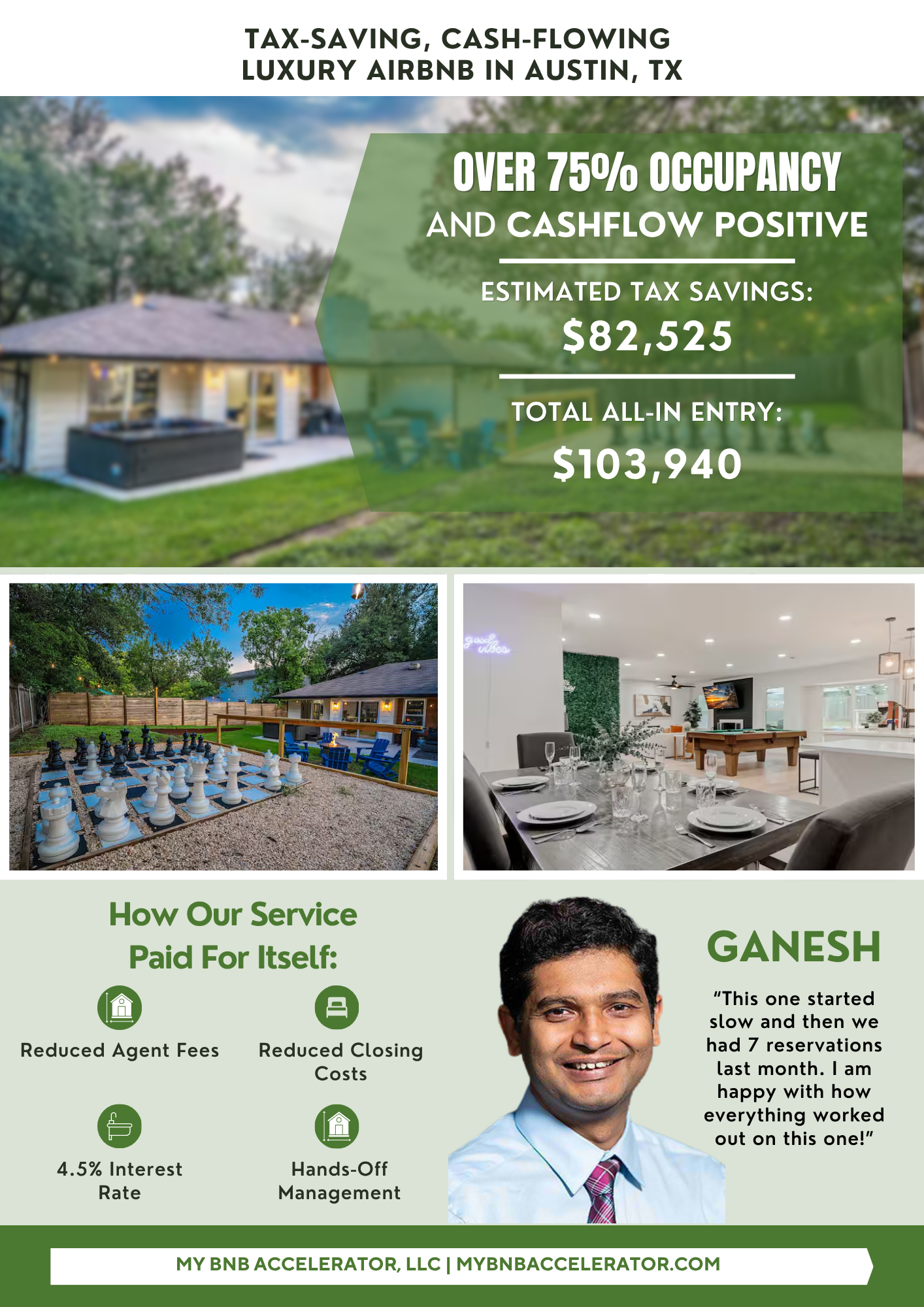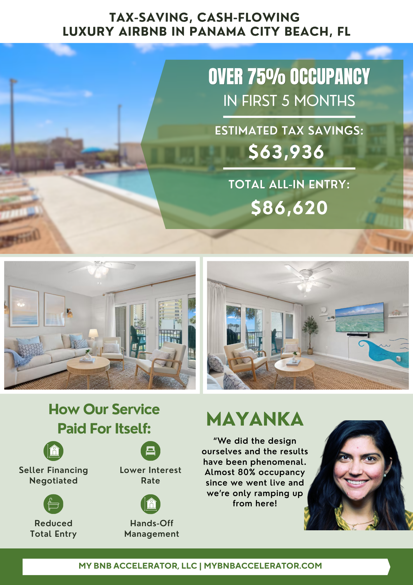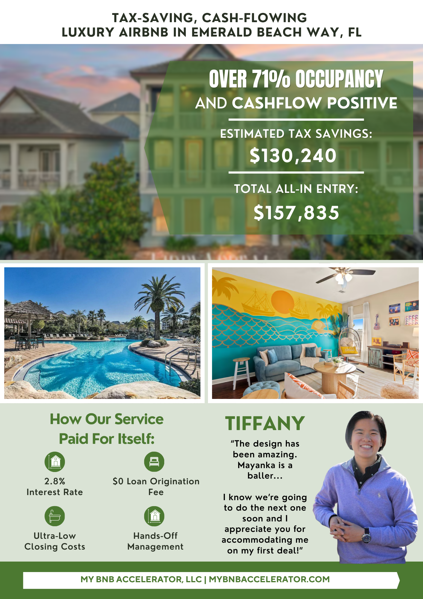We (My BnB Accelerator, LLC) are not an attorney or legal counsel, nor does Company represent itself as such. Company does not provide any legal advice - Client must engage with proper Legal counsel with an outside third party for all matters related to legal counsel or legal advice. Company My BnB Accelerator, LLC is not a Certified Professional Accountant (CPA) or Tax Advisor, nor does Company represent itself as such. Company does not provide any Tax advising. Client must engage with proper Tax advising and Tax Strategy counsel with an outside third party for all matters related to Tax strategy, tax preparation, and bonus depreciation items. Company My BnB Accelerator, LLC works with their own third party tax advisors, Certified Professional Accountants, attorneys, lenders, and other specialty advisors that are all third party services. Client is ultimately responsible for verifying their work with any and all third party vendors not associated with the immediate My BnB Accelerator, LLC team. Please note that we may be affiliates of the vendors we recommend. You are absolutely under no obligation to use their products or services but if you do choose to use them, we may earn a small commission at no extra cost to you. The content in these videos and written content across these pages shall not be construed as tax, legal, insurance, construction, engineering, health & safety, electrical, or financial advice; it is your responsibility to verify all information yourself. It is highly recommended that you speak with a tax professional or tax attorney before performing any of the strategies mentioned in this video.